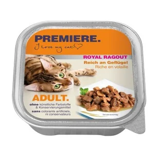 Twój kot pokocha smaczne danie Royal Ragout. Starannie dobrane składniki i zrównoważony skład sprzyjają optymalnemu zaopatrzeniu w składniki odżywcze. Warto rozpieszczać swojego pupila, podając mu soczyste kawałki w pysznym sosie. Karma Premiere Royal Ragout jest bogata w mięso i nie zawiera sztucznych barwników ani konserwantów. Karma pełnoporcjowa dla kotów, pozostałe informacje można uzyskać pod adresem: