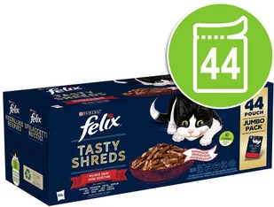 Każdy posiłek to pyszna niespodzianka: karma Felix Tasty Shreds jest dostępna w dwóch różnych kreacjach, z których każda zawiera kilka smakowitych wariantów. Dzięki temu nuda w jadłospisie Twojego pupila nie ma żadnych szans. Felix Tasty Shreds to kompletna, zbilansowana karma mokra dla dorosłych kotów, która dostarcza do organizmu Twojego ulubieńca cenne składniki, w tym kwasy tłuszczowe omega-6 oraz witaminy D i E. W skład prezentowanej karmy dla kotów wchodzą delikatne ,,skrawki" mięsa lub ryby, zanurzone w pysznym sosie.