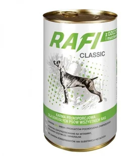 Karma mokra dla psa Rafi Classic Adult z dziczyzną i marchewką 1240g x 12 Karma mokra dla psów wszystkich ras Rafi Classic Adult 1240g Karma pełnoporcjowa dla dorosłych psów wszystkich ras. Kawałki z drobiem w sosie. Karma odznacza się wyjątkową smakowitością, którą gwarantuje wysoka zawartość składników mięsnych, pochodzenia zwierzęcego. Karma nie zawiera substancji smakowo-nęcących, a pomimo tego jest bardzo apetyczna. Dzięki smakowitemu sosikowi, w którym pływają całe kawałki mięsa.