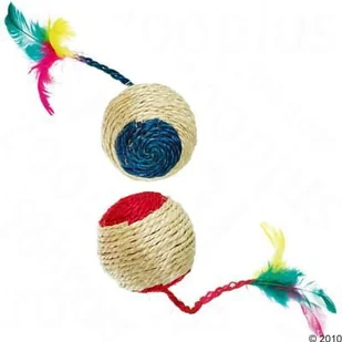 Z zabawnie kołyszącymi się piórami. Praktyczny rozmiar. Długotrwała zabawa. Kolor: beżowy/czerwony lub beżowy/niebieski (brak możliwości wyboru). Materiał: sizal. Wymiary: O 6 cm. Uwaga! Zawsze pilnuj swojego pupila podczas zabawy, bez względu na rodzaj używanej zabawki.