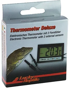 Ten elektroniczny termometr posiada dwa zdalne czujniki, dzięki czemu może mierzyć temperaturę w dwóch punktach terrarium. Zdalne czujniki nadają się również do pomiarów w wodzie. Urządzenie posiada duży wyświetlacz i dodatkową funkcję zegara. Lucky Reptile Thermometer Deluxe Termometr elektroniczny z czujnikiem zewnętrznymMierzy temperaturę w dwóch różnych miejscachCzujniki mogą być również używane pod wodą! (A więc również w akwariach) Termometr dla gadów Lucky Reptile Gady żyją głównie w ciepłym środowisku. Aby zmierzyć idealną temperaturę życia, potrzebujesz tego termometru dla gadów.