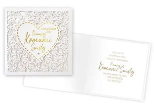 wielkość: niestendardowa, prostokątna, kwadratowa, zdobienia: dekoracje ze złotej folii, doklejane koraliki, tłoczenia koperta: dopasowana w komplecie, wnętrze kartki: życzenia w środku, okazja: komunia.
