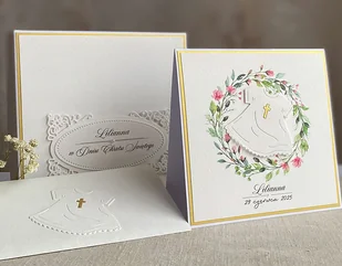 Elegancka, ręcznie wykonana pamiątka chrztu dla chłopca, kartka w pudełku z ozdobną kopertą. Delikatne i subtelne połączenie bieli i matowego złota. W środku kunsztownie wykończonego pudełka znajduje się miejsce ...
