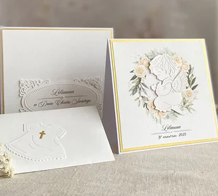 Elegancka, ręcznie wykonana pamiątka chrztu dla chłopca, kartka w pudełku z ozdobną kopertą. Delikatne i subtelne połączenie bieli i matowego złota. W środku kunsztownie wykończonego pudełka znajduje się miejsce ...