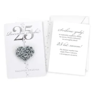 Kartka Dream Cards "25 rocznica ślubu" DK-1235 Kartka B6 z ozdobnej serii Dream Cards na urodziny z wymiennymi cyframi - nieduża, ale robi wrażenie dzięki atrakcyjnej kolorystyce i ciekawym zdobieniom. To idealny wybór łączący przyjazną cenę z jakością. Cechy szczególne wielkość B6, 16. 6 x 11. 7 cm po złożeniu, koperta w zestawie, kolorowa, zdobienia kolorowe, różnorodne, bogate w zależności od wzoru przyklejane dekoracje, elementy biżuteryjne, odstawniki, metaliczne folie, tłoczenia itp. , okazja Rocznica ślubu