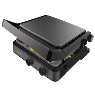 Grill elektryczny Cecotec Rock'grill 2200 Dual to nowoczesna i wszechstronna opcja dla tych, którzy cenią sobie komfort w kuchni, łącząc moc 2200 W z elegancką obudową ze stali nierdzewnej w czarnym kolorze. Grill ten charakteryzuje się możliwością otwarcia 180 stopni, co zwiększa powierzchnię do gotowania i pozwala na przygotowywanie większych porcji jedzenia, z możliwością użycia obu płyt jednocześnie.