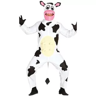 Kostium KROWY to biały KOMBINEZON w czarne ciapki. Przebranie posiada wszystkie charakterystyczne elementy chociażby takie jak wymiona, jak również doczepiony ogon. Dodatkowo w zestawie znajduje się KAPTUR imitujący głowę krowy - nie utrudnia widzenia ani oddychania.
