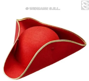 KAPELUSZ BAROKOWY CZERWONY; Kapelusz trikorn w kolorze czerwonym. Wykonany z filcu, zdobiony złotą lamówką. Obwód - ok. 57 cm.