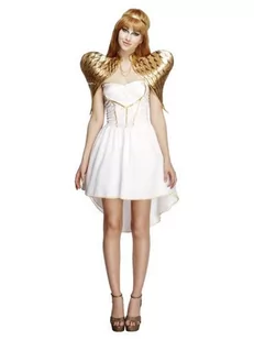Strój anielicy dla dorosłych, rozmiar S strój anielicy dla dorosłych zestaw zawiera: sukienkę, skrzydła, opaskę asymetryczna sukienka w kolorze bieli ze złotymi wstawkami skrzydła złote, zakładane na ramiona opaska złota, na gumce rozmiar: S