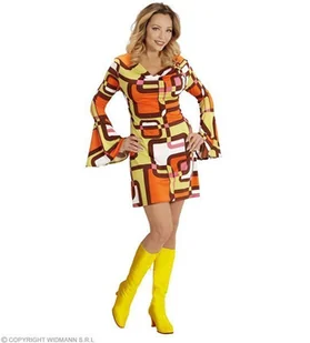 Strój dla dorosłych, hippie lat 70, rozmiar M strój dla dorosłych, hippie lat 70 sukienka w kolorowy wzór zakładana przez głowę rękawy rozszerzane u dołu roz...