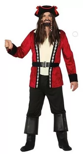 strój dla dorosłych, Pirat w zestawie znajduje się: marynarka z wszytą bluzką, pasek, spodnie, kapelusz bordowa marynarka z materiału imitującego aksamit, w przodzie wszyta kremowa bluzka czarne spodnie,pasek z klamrą kapelusz zdobiony czerwoną lamówką i kokardkami rozmiar: L