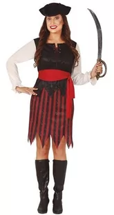 strój dla dorosłych, Piratka zestaw zawiera: bluzkę, spódnicę, pasek, kapelusz bluzka czarna z białymi rękawami spódnica w czarno-czerwone paski, mocowana na gumce w pasie pasek materiałowy, czerwony kapelusz czarny z filcu rozmiar: L