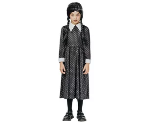 STRÓJ DLA DZIECI GOTYCKA UCZENNICA (SUKIENKA W GROSZKI) Rozmiar: 130/140 cm Długość sukienki: 99 cm Długość rękawa: 46 cm Szerokość pod pachami: 36 cm Szerokość w pasie: