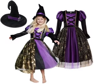 STRÓJ KOSTIUM SUKIENKA WIEDŹMA CZAROWNICA WRÓŻKA NA HALLOWEEN BAL 104 / 110 CM (z metki 110) STRÓJ NA HALLLOWEEN ------------------------------------------- ⭐ OPIS PRODUKTU: Fantastyczny strój odzwierciedlający postać tajemniczej czarownicy, Zestaw składa się z sukienki oraz kapelusza, który dopełnia całą kreację, Sukienka z długim bufiastym rękawem, dodającym wyjątkowości i uroku, W pasie znajduję się elastyczna gumka, dzięki której sukienka staje się lepiej dopasowana, Strój wykonany z wysokiej jakości materiału, zapewniającego maksymalną swobodę ruchów podczas zabawy, Sukienka posiada podszewką, która zapewnia wygodę noszenia, a kilka warstw tiulu nadaje jej lekkości i elegancji, Całość dopełniają złote akcenty - wzór pajęczej siatki, Kapelusz czarodzieja o uniwersalnym rozmiarze, świetnie dopełnia przebranie. Strój idealnie sprawdzi się na Halloween, imprezę karnawałową, bal przebierańców czy inne tematyczne przyjęcie! ⭐ SERDECZNIE POLECAMY! ⭐ STRÓJ NA HALLOWEEN DLA DZIECI ------------------------------------------- ⭐ SPECYFIKACJA SUKIENKI: Rozmiar - 104/110 (z metki 110) Długość całkowita - 73 cm Szerokość pod paszkami - 32 cm Szerokość w pasie - 31 cm Wymiary mierzone ręcznie, na płasko. Błąd pomiaru może wynieść +/- 2cm.