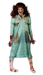 Sukienka zapinana z przodu na rzepy. Akcenty w postaci kwiatów, koronki i ozdobnych, białych guzików. Na końcu rękawów ściągacze. Posiada ubrudzenia imitujące plamy krwi. Skład: 100% poliester.