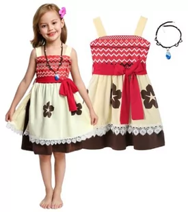 STRÓJ PRZEBRANIE KOSTIUM SUKIENKA POPULARNEJ BOHATERKI MOANA VAIANA + NASZYJNIK Oferta dotyczy rozmiaru 110/116 (5-6 lat) STRÓJ PRZEBRANIE KOSTIUM SUKIENKA MOANA VAIANA: Opis produktu: Kostium odwzorowany na podobieństwo stroju bohaterki z animacji "Vaiana: Skarb Oceanu", Krótka sukienka na grubych ramiączkach w kolorze czerwono-beżowo-brązowym, z czerwoną wstążką do wiązania kokardy, Śliczna, bardzo dobrej jakości sukienka wykonana z elastycznego materiału, Trapezowa spódniczka z gumką wszytą w pasie, kwiecistym wzorem, obszyta białą koronką, Miły w dotyku materiał zapewniający komfort użytkowania i swobodę ruchów, Dodatkowo w zestawie dostaną Państwo naszyjnik. Idealny strój na bal, karnawał, urodziny lub do codziennej zabawy.