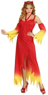 Świetny strój diablicy na Halloween lub Karnawał. Zestaw zawiera długą czerwono żółtą sukienkę z postrzępionym dołem. W zestawie również rękawki imitujące płomienie oraz czerwone rogi DIABŁA. Całe przebranie rzuca się w oczy a przy tym wygląda seksownie.