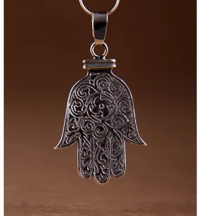 Dłoń Fatimy - Fatima była córką proroka Mahometa. Pięć palców dłoni to pięć strzał Islamu. Jest potężnym amuletem ochronnym. Pomaga osiągnąć siłę, moc, wzmocnić wiarę, mieć szczęście do Łaski Bożej. Chroni przed strachem, przygnębieniem, nieszczęściem, pechem.