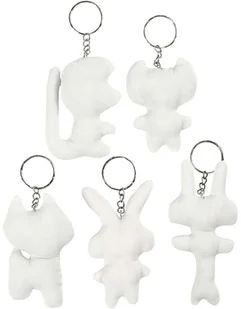Małe pluszaki z białej bawełny (100%) wypchane watoliną. Każdy ma inny kształt i zamocowane kółko do breloczków z łańcuszkiem. Idealne do pomalowania farbami oraz markerami do tkanin lub obklejenia masami plastycznymi. Można do nich przyszyć różne małe ozdóbki, np. cekiny czy guziczki. Świetna baza do stworzenia niepowtarzalnego breloczka. Nieodpowiednie dla dzieci w wieku poniżej 36 miesięcy.