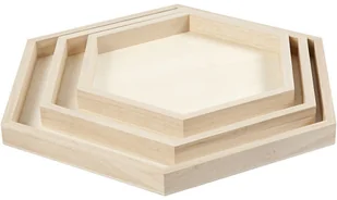 Zestaw 3 sześciokątnych tac w różnych rozmiarach, z drewna paulowni cesarskiej. Idealne do pomalowania farbami akrylowymi, ozdobienia techniką decoupage lub obklejenia masami plastycznymi, papierem itp. Wielbiciele naturalnego drewna mogą po prostu zostawić je nieozdobione lub wypalić wzorki i cieszyć się ozdobą mieszkania. Nieodpowiednie dla dzieci w wieku poniżej 36 miesięcy.