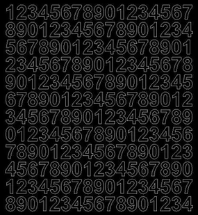 Cyfry wycinane ploterowo po obrysie (bez tła). Ilość cyfr jak na zdjęciu głównym. Kolor czarny z połyskiem Rozmiar arkusza 21x25 cm Wysokość znaku 1,5 cm Trwałość 3-4 lata Grubość folii 70 mikronów Rodzaj folii Oracal 641