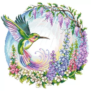 Zestaw do haftu - Bajkowy koliber Zestaw do haftu zawiera: kanwę czystą typu Aida (100% bawełna) o gęstości 54 oczek/10 cm (14ct), mulinę, igłę oraz kolorowy wzór graficzny. Zestaw nie zawiera ramki. Rozmiar w krzyżykach: 162 x 162 Rozmiar w cm: