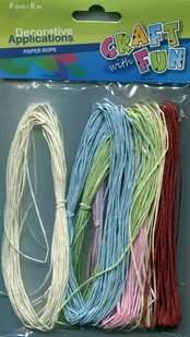 Ozdoba dekoracyjna - sznurek papierowy, każdy po 8m długości. Mix sześciu kolorów w opakowaniu- niebieski, kremowy, żółty, zielony, różowy, czerwony.