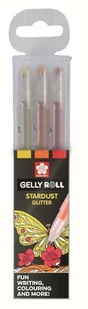Zestaw 3 żelopisów Gelly Roll Stardust Happy Set Seria Stardust to jedyne długopisy w brokatowych kolorach należące do rodziny Gelly Roll. Można ich używać na papierach o zarówno jasnych, jak i ciemnych barwach. Kolory: 703 (żółto- złoty), 705 (pomarańczowy), 719 (czerwony)