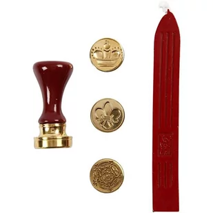 zestaw do lakowania kopert w skład zestawu wchodzą: 3 jednostronne pieczęci, 1 rączka do pieczęci, 1 patyczek laku z knotem (długość 9,5 cm) lak w kolorze czerwonym średnica pieczęci 17 mm, włożonej w rączkę 18 mm Instrukcja użycia: umieść pieczęć w rączce i schłodź ją, kładąc na kostce lodu lub ręczniku papierowym nasączonym zimną wodą rozpuść porcję laku nad kopertą osusz pieczęć i przyciśnij ją do laku, odczekaj 30 sekund i zdejmij pieczęć, lekko nią kołysząc Nieodpowiednie dla dzieci w wieku poniżej 36 miesięcy.
