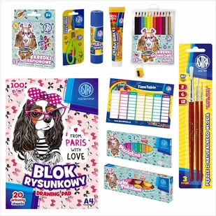 Skład wyprawki*: • Kredki grafionowe Pieski 12 kolorów • Kredki ołówkowe jumbo okrągłe Pieski 12 kolorów + temperówka • Blok rysunkowy ASTRAPAP A4 100g 20 ark „Puppy&Unicorn&Mini” • Plastelina Pieski 12 kolorów • Farby plakatowe Pieski 12 kolorów 20 ml • Zestaw pędzli z naturalnego włosia Astra - 3 sztuki rozmiary 2/6/12 • Klej w sztyfcie Astra 8g • Nożyczki easy open • Klej biały zapachowy 45 ml-poziomka • Plan lekcji