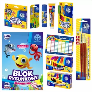 Skład wyprawki*: • Kredki świecowe 12 kolorów • Kredki ołówkowe trójkątne jumbo Astra 12 kolorów • Blok rysunkowy ASTRAPAP A4 100g 20 ark „Puppy&Unicorn&Mini” • Plastelina Astra 12 kolorów • Farby plakatowe Astra 6 kolorów - 20 ml • Zestaw pędzli z naturalnego włosia Astra - 3 sztuki rozmiary 2/6/12 • Klej w sztyfcie Astra 8g • Nożyczki easy open • Klej biały zapachowy 45 ml-poziomka • Plan lekcji