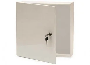 drzwi zamykane zamkiem bębenkowym z 2-oma kluczykami w komplecie. tył: ścianka wykonana z blachyprzebitki o średnicy 35mm w górnej i dolnej ściance na wyprowadzenie przewodów. Przeznaczenie - zastosowanie do zabudowy natynkowej przy średnich i dużych instalacjach antenowych celem zabezpieczenia rozgałęźników, wzmacniaczy, zasilaczy itp.