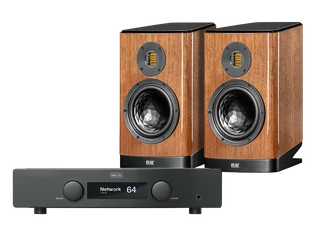 Zestaw stereo składający się ze wzmacniacza zintegrowanego Hegel H95 oraz głośników ELAC Vela BS404.2