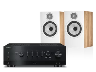 Zestaw stereo składający się z sieciowego amplitunera stereo Yamaha R-N800A oraz kolumn Bowers & Wilkins 606 S3.
