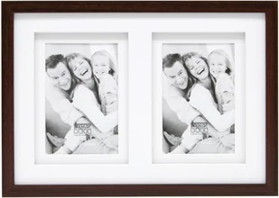 Drewniana ramka na zdjęcia w kolorze brązowym Seria Deknudt S65KQ wysokiej jakości rama z podwójnym passepartout Drewniana ramka galeryjna na 2 zdjęcia 15x20 cm formowanie: Profil blokowy, foliowany Szkło: myte szkło zwykłe Przejście: przejścieskośne, przejście podwójne Ściana tylna: płyta pilśniowa, z podstawką do formatu poziomego Zawieszenie: