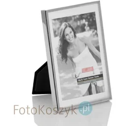 Metalowa ramka fotograficzna na zdjęcie wielkości 10 na 15cm. Ładna, solidna, ciężka ramka wykonana jest ze srebrnego metalu. Metal jest błyszczący, ramka jest cienka. Z tyłu ramka wykończona jest czarnym aksamitem. Ramka zapakowana jest w pergamin i w białe pudełko.