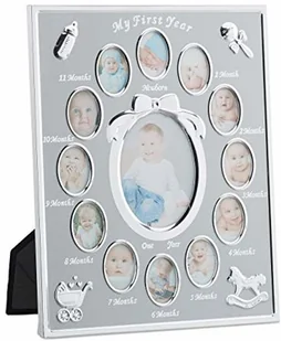 huśtawka, wózek, butelka ze smoczkiem i łyżeczka - Uchwyć pierwsze 12 miesięcy swojego dziecka - Z rozkładaną podstawkąZakres dostawy - 1 x ramka na zdjęcia "First Year" - ElementyReplika acyjne nie wchodzą w zakres dostawy Opis produktu Uchwyć niezapomniane chwile z pierwszego roku życia dziecka. Ozdobna ramka na zdjęcia dziecka jest idealna do pokazania swojej dumy i radości gościom. Srebrną ramkę uzupełniają aplikacje 3D z dziecięcymi motywami. Ramka na zdjęcia dziecka to piękny prezent z okazji narodzin lub chrztu dziecka. Ramka na 13 zdjęć w szczegółach- Wymiary całkowite wys.