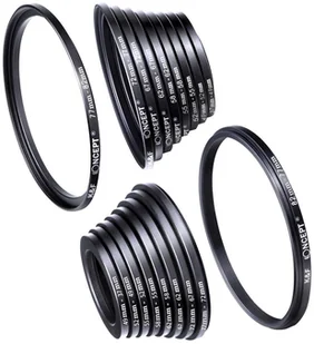 Zestaw zawiera 18 sztuk redukcji filtrowych w zakresie od 37mm do 82mm - 9 sztuk w górę i 9 sztuk redukujących w dół.