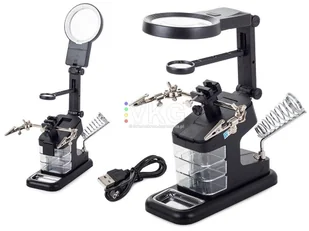 Dodatkowa soczewka, posiada również regulację w pionie. Dla lepszego komfortu pracy, lupa posiada również otwierane szufladki oraz wyjmowaną metalową tacę. Trzecia ręka pozwala na prace takie jak: Lutowanie Klejenie Naprawy Specyfikacja techniczna: Wykonany z wysokiej jakości materiałów Wysoka jakość wykonania Posiada podświetlenie 10 LED SMD, które są umieszczone na ramieniu dla regulacji kąta świecenia Ramie regulowane w dwóch płaszczyznach Zasilanie: