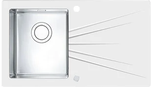 Zlewozmywak szklany biały lewy KARAT 10 Materiał: szkło hartowane + stal nierdzewna CrNi 18/10 Minimalna podbudowa: 450mm Wymiary zlewozmywaka: 860 x 500 mm Wymiary komór: 340 x 400 x 195 mm Odpływ: