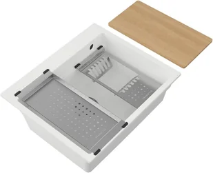 Łatwo go zamontujesz, a w zestawie znajdziesz również dopasowane akcesoria metalowe oraz drewniane. Dzięki temu możesz kupić jeden produkt i uzupełnić wyposażenie całej kuchni. Zlewozmywak granitowy Massimo 1-komorowy bez odpływu biały + akcesoria cechuje prostokątny kształt, dlatego pasuje on do większości aranżacji wnętrz. Połączenie kwarcu i żywicy sprawia, że wystarczy codzienne przetarcie, aby zachować go w dobrej kondycji. Sprawdź też inne zlewozmywaki z naszej oferty.
