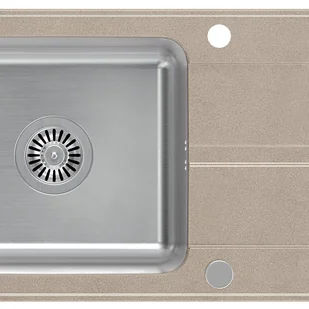 Zlewozmywak wyposażony jest w duży ociekacz, którego kształt gwarantuje bieżące odprowadzanie wody bezpośrednio do komory. Jednocześnie tworzy dodatkową przestrzeń odkładczą w linii blatu kuchennego, gdzie swoje miejsce mogą znaleźć opłukane naczynia czy produkty spożywcze, bez obawy, że płyn wydostanie się poza obręb zlewu, doprowadzając do uszkodzeń blatu. Standardowo zlew posiada 2 wybite otwory w blacie. Klasycznie, jeden z nich dedykowany jest montażowi baterii, natomiast drugi stanowi możliwość uzupełnienia zlewu o dodatkowe funkcje. Estetycznie zaślepiony, może być wykorzystany jako miejsce do mocowania dozownika płynu, lub być bazą dla innego rozwiązania, które będzie spełniało swoją rolę w kuchni.
