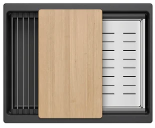 Wewnątrz komory zlewozmywaka zastosowany został dodatkowy rant, na którym oparcie znajdują zwijana Qmata oraz stalowa wkładka ociekowa. Deska ma swoje miejsce na wierzchu komory. Zastosowanie tych elementów powiększa powierzchnię roboczą w kuchni i pozwala z powodzeniem wykorzystać komorę jako dodatkowe miejscerobocze, do krojenia, czy suszenia.