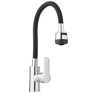 Bateria kuchenna z elastyczną wylewką Mechaniczna bateria zlewozmywakowa, ścienna, jednouchwytowa. Posiada długą, ruchomą, elastyczną, silikonową wylewkę w kolorze czarnym. Bateria wyposażona jest w dwustrumieniową końcówkę, dzięki której możemy zmienić strumień wody z klasycznego, na rozproszony. Elastyczna wylewka natomiast daje nam możliwość nie tylko szybkiego opłukiwania naczyń czy umycia zlewu, ale również wygodnego napełniania garnków wodą. Napowietrzająca końcówka - perlator - ogranicza zużycie wody nawet o 40%.