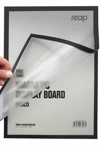 Tabliczka magnetyczna, samoprzylepna A3 Prosta w użyciu samoprzylepna ramka z tworzywa, która pozwala na błyskawiczną wymianę informacji. Treść prezentowana w ramce jest zabezpieczona dzięki wierzchniej warstwie foliowej. Tylna część ramki jest pokryta klejem, dzięki czemu można ją szybko zamontować na gładkich powierzchniach. Późniejsza wymiana informacji polega tylko na uniesieniu przedniej części, która przylega dzięki paskom magnetycznym. Dane techniczne Format plakatu do wstawienia A3 Wymiary miejsca na plakat / reklamę :