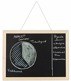 Uwaga: Należy pamiętać o usunięciu folii ochronnej przed pierwszym użyciem. Tablica kredowa z drewnianą ramą w szczegółach - Wymiary dużej tablicy wys. x szer. : ok. 40 x 60 cm / ok. 500 g - Wymiary małej tablicy kredowej wys. x szer. : ok. 30 x 40 cm / ok.