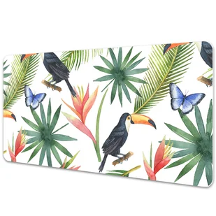 Podkładka na biurko z nadrukiem Tropikalne tukany na gałęzi 90x45 cm Podkładka winylowa na biurko to nie tylko praktyczny dodatek, ale także dekoracyjny element, który subtelnie podkreśli styl każdego pomieszczenia, bez względu na wiek czy charakter. Każdy blat, na którym zdecydujesz się położyć naszą wyjątkową podkładkę, nabierze nowego wymiaru estetycznego, wzbogacając zarówno przestrzeń dziecięcego pokoju, jak i eleganckiego biura. Wygląd naszej podkładki winylowej jest rezultatem precyzyjnego, cyfrowego druku, który podkreśla intensywność kolorów i detalii wzoru. Po rozłożeniu maty możesz spokojnie pracować, nie martwiąc się o niechciane rysy czy inne uszkodzenia. Mata jest niezwykle wytrzymała i solidna.