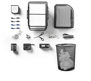 Kosz na śmieci, taca na dokumenty, przegrody na prasę, przybornik i blok z karteczkami (100 szt.) wykonane z eleganckiej siatki stalowej. Zszywacz posiada unikalny system ładowania, który pozwala używać zszywek 24/6 lub 26/6. Nożyczki zaprojektowane dla osób prawo- i leworęcznych. Rozpinacz skutecznie usuwa zszywki i rozpina pliki dokumentów. Zszywki w zestawie (1000 sztuk), odpowiednie do większości zszywaczy. Spinacze biurowe (100 szt.), wykonane z wytrzymałego drutu stalowego. Uchwyt na taśmę odpowiedni do taśmy o długości 33 m, wykonany z plastiku i metalu. Taśma dostarczana w opak. po 8 szt. Długość 33 m. Długopisy kulkowe (dwa niebieskie i dwa czarne) z gumowym uchwytem, klipsem i funkcją na klik.