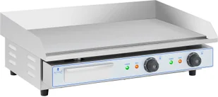 3Wymiary wysyłki (DxSxW) [cm] 79 x 58. 5 x 32Waga wysyłki [kg] 36. 4Zakres dostawyPłyta grillowa RC-EG001Instrukcja obsługiKluczowe informacjeElastyczność - gładka powierzchnia sprawia, że idealnie nadaje się do różnorodnych dań w restauracjach, barach z przekąskami i mobilnej gastronomiiSiła - z mocą 2 x 2200 W i zakresem temperatury 50-300°CProfesjonalizm - doskonale usmażone jedzenie dzięki w pełni automatycznemu sterowaniu termostatemPraktyczność - osłona przeciwbryzgowa i pojemnik na tłuszcz oraz olej dla czystej i wygodnej pracyTrwałość - dzięki wysokiej jakości wykonania, obudowie wykonanej ze stali nierdzewnej oraz stalowej płycie grzewczejPodwójna elektryczna płyta grillowa wykonana ze stali do chrupiących i smacznych specjałówDzięki podwójnej płycie grillowej z oferty gastronomicznej Royal Catering możesz rozpieszczać swoich gości pysznymi i obfitymi specjałami z grilla przez cały rok. Czy to soczyste steki i hamburgery, ryby, omlety, tortille, czy warzywa - z tym modelem Twoja wyobraźnia nie ma granic. Sprzęt zapobiega wydzielaniu dymu oraz zapewnia higieniczny i bardzo czysty sposób pracy.