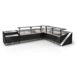 Kompletny ciąg chłodniczy z wewnętrznymi agregatami, obejmujący 2 moduły L-X 188/120, ladę kasową LK-SiX, moduł L-X/NW i boki kończące. Pełna usługa montażowa "pod klucz".